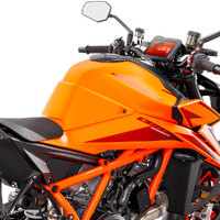 Ergonomics: Let's not mince words. The KTM 1390 SUPER DUKE R is a 100%, hardcore, and a dominant performance machine. For that reason, it is ergonomically styled for sporty riding. The tank is angled slightly outwards, providing more support under braking, as well as better contact while knee down. The handlebar is also lower for improved control without compromising comfort.