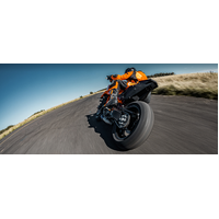 Wheels and Tires: The KTM 1390 SUPER DUKE R comes fitted as standard with lightweight, MICHELIN Power GP rubber. Thanks to the dual compound technology, these tires provide enhanced grip both on straight-line acceleration and more importantly, at lean-angle. Not only do they promise exceptions to track performance, but they offer outstanding road manners too in both wet and dry conditions.