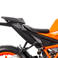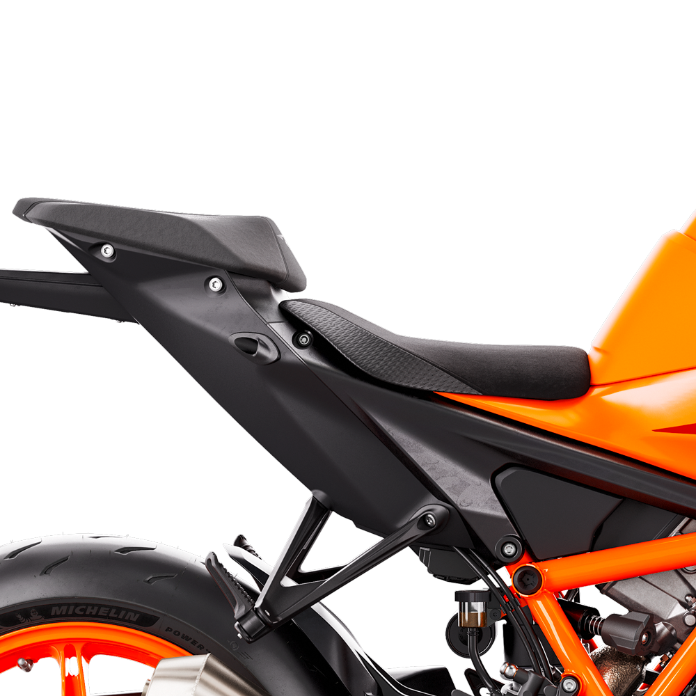 Seat: Performance-focused, but still comfortable for all-day riding, the KTM 1390 SUPER DUKE R is designed to be track-capable one second, and a real-world passenger motorcycle the next. For that reason, the seat is made to be ultimately usable in all scenarios. At 834 mm, it's the perfect height for aggressive track work, but low enough to provide easy access and comfort. The pillion seat wasn't forgotten here either, making it equally as comfortable for longer rides.
