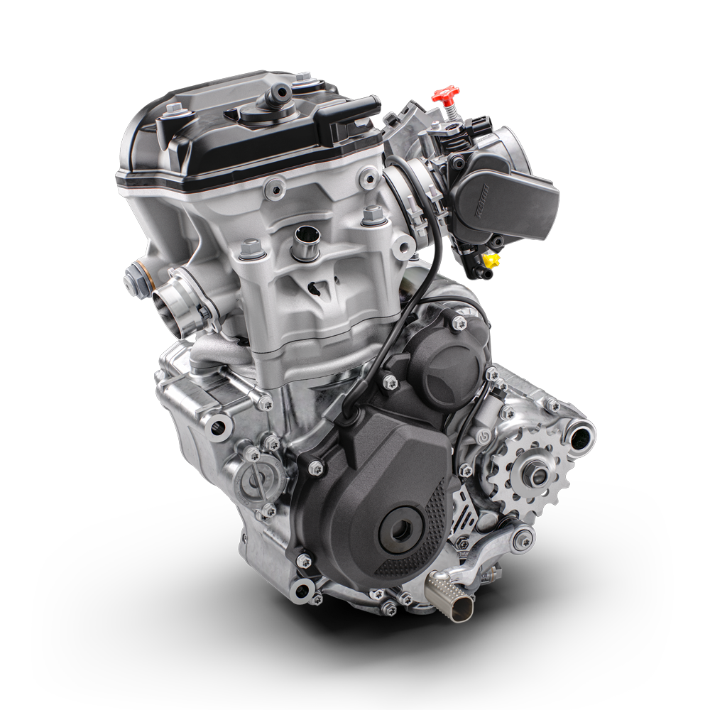 Performance: The KTM SX-F engine is tilted 2° backward, this means greatly improved mass centralization and reduced overall weight, benefiting handling and anti-squat behavior. A silencer offers an improved response in combination with the mapping switch and provides a slightly quieter exhaust note.