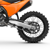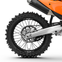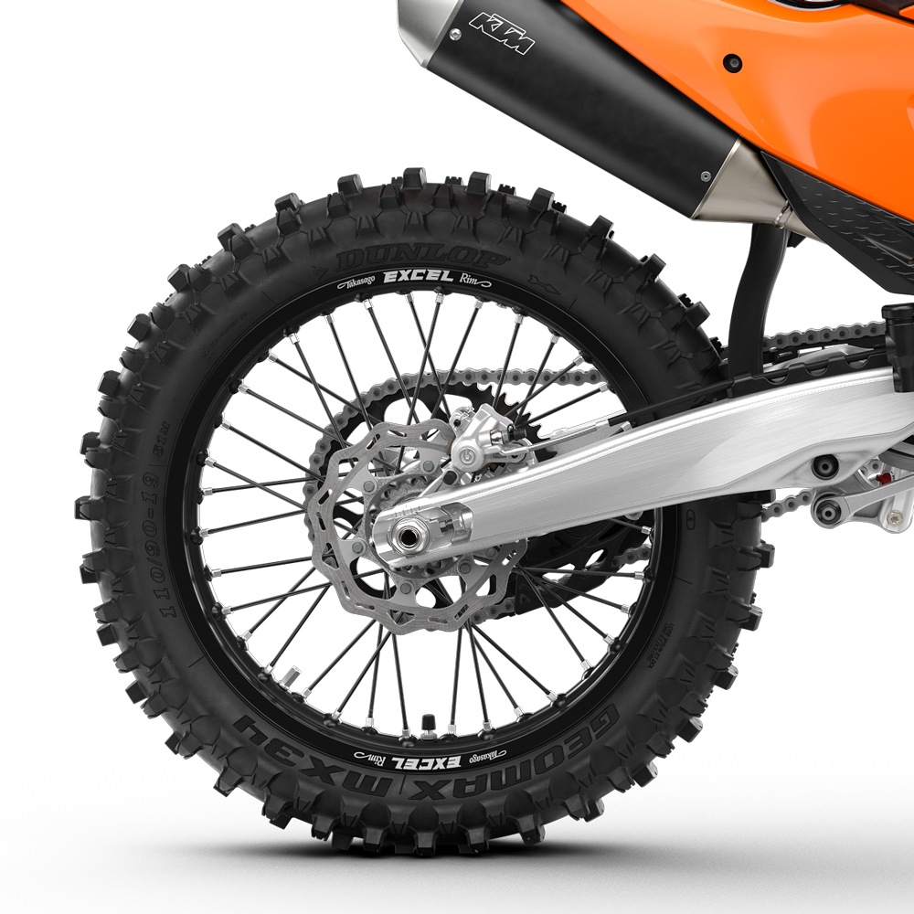 Tires: Getting power hooked into the dirt is a tough job. However, hours of research and testing have led the KTM Motocross range to the Dunlop GEOMAX MX34. Providing unmatched stability and control at the highest level, the rubber features a rigid carcass and rubber compound that improves damping and absorption, maintaining performance up to 30% longer than previous models. Progressive Cornering Block Technology also improves grip in the berms, while the rear pattern has a tall and wide center block for desirable traction and control everywhere else. Lastly, this unique block arrangement works to dispel mud buildup, ensuring traction in even the muddiest of track conditions.