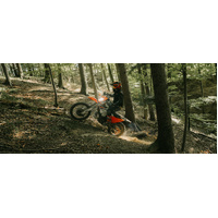 Frame: Specifically engineered for longitudinal rigidity, the KTM 300 EXC HARDENDURO is engineered around a gloss-orange powder-coated frame providing exceptional rider feedback, energy absorption, and high-speed stability. This is achieved by repositioning the rotating masses in the frame along with a forged steering head connection. The footrest mounts also feature a slim design for less risk of hooking up. And when the ride comes to an end, a forged one-piece side stand ensures your enduro weapon stands proud.