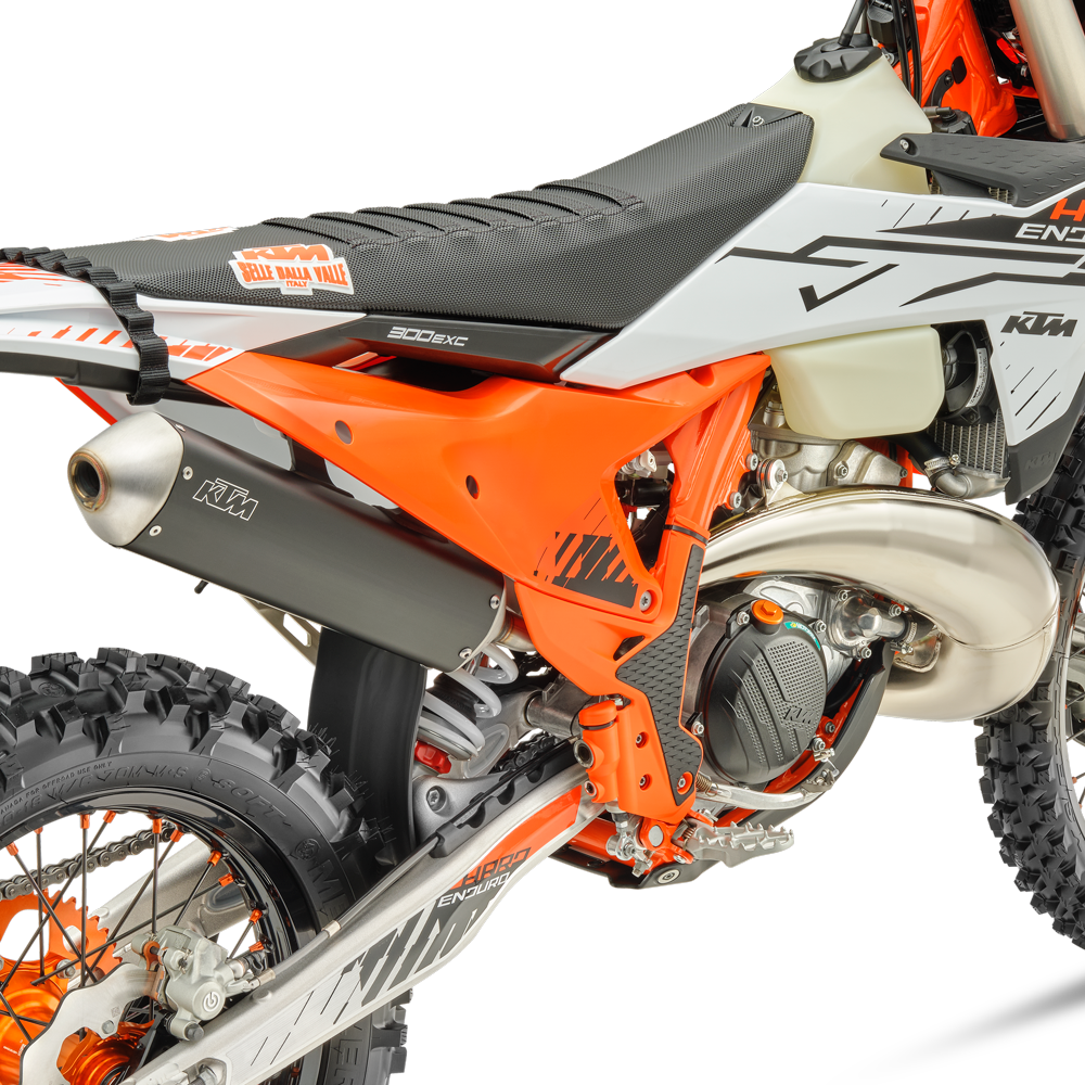 Exhaust: Bringing the Braaap! Thanks to the KTM 300 EXC HARDENDURO's compact engine design, the header pipe is designed with the target of achieving more ground clearance and reducing the risk of damage when riding over deep roots, ruts, or climbing steep rocks. The silencer is crafted from lightweight aluminum, saving weight and provides the signature low-down 2-stroke burble for this rock-hopping hero.