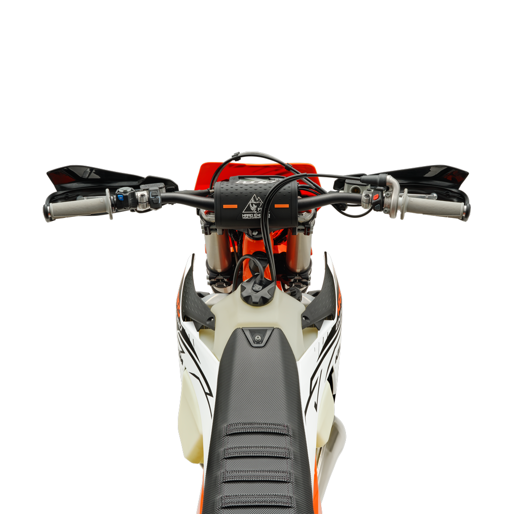 Handlebars: Held in place by a set of CNC-machine triple clamps, the handlebar on the KTM 300 EXC HARDENDURO features a unique bar pad and soft, grey, ODI lock-on grips for ultimate control. A set of wrap-around handguards provides further protection from unwanted obstacles in your path.