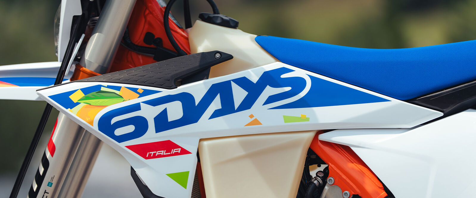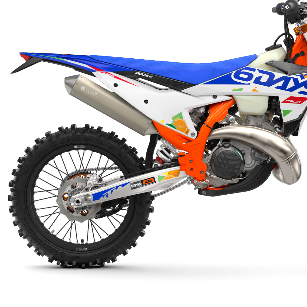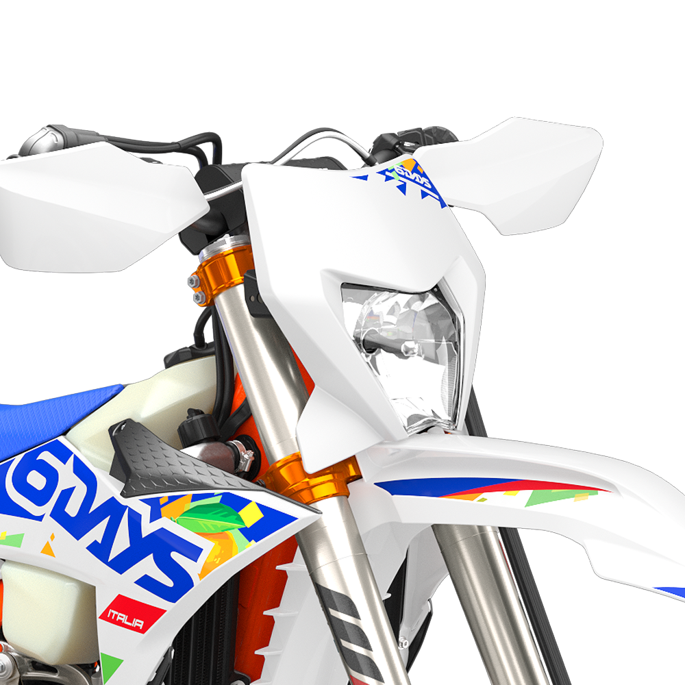 Graphics: The KTM 6DAYS range sends a high-flying salute to the ISDE Italia, with striking graphics incorporating the colors of the Italian flag, a glossy orange frame, and striking blue finishes.