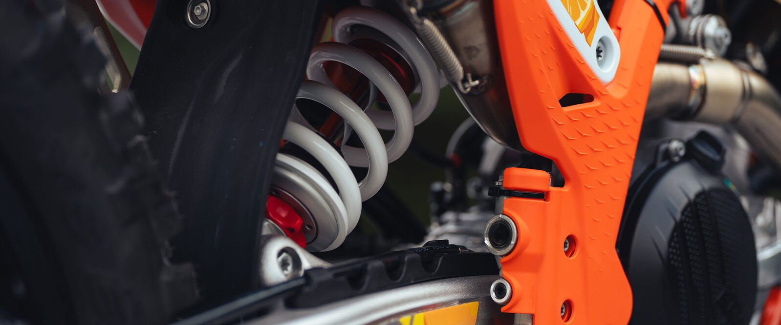Air filter box: The air filter box is designed to ensure maximum airflow with minimal water intrusion. Precision in how the inlet ducts are positioned is aimed at preventing air deformation and maintaining filter protection. An enduro-specific splash protector under the airbox prevents water or dirt from splashing up from the rear wheel, while the Twin Air filter and air filter support design features a simple fail-proof mounting system for safe and accurate filter installation. All this ensures the air filter is easily accessed, without tools, for fast track-side maintenance.