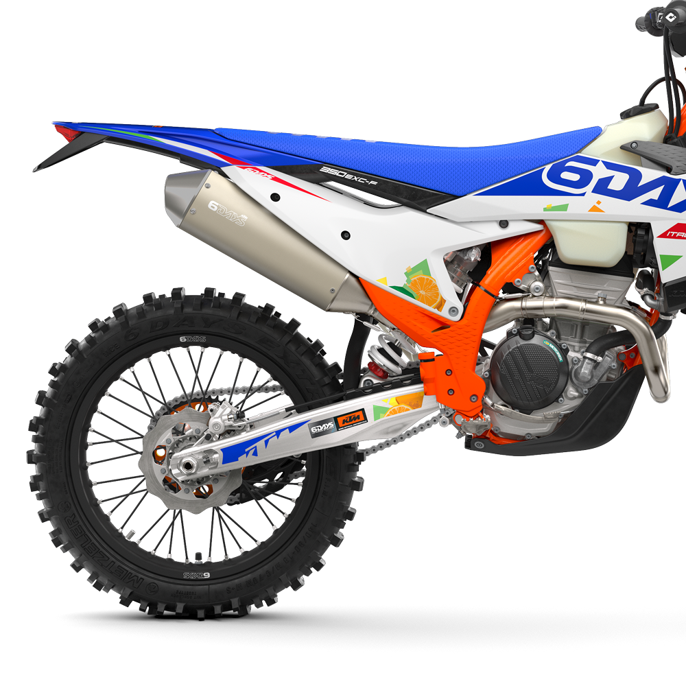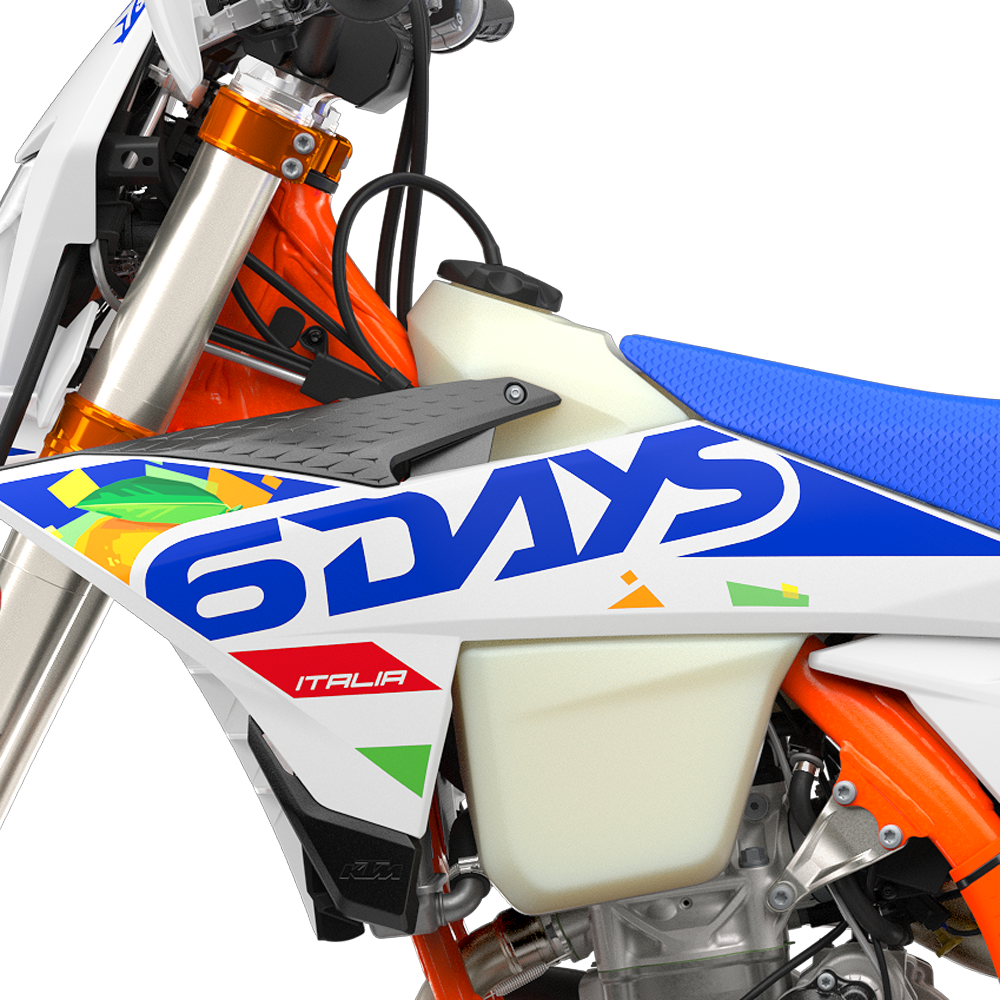 Graphics: The KTM 6DAYS range sends a high-flying salute to the ISDE Italia, with striking graphics incorporating the colors of the Italian flag, a glossy orange frame, and striking blue finishes.