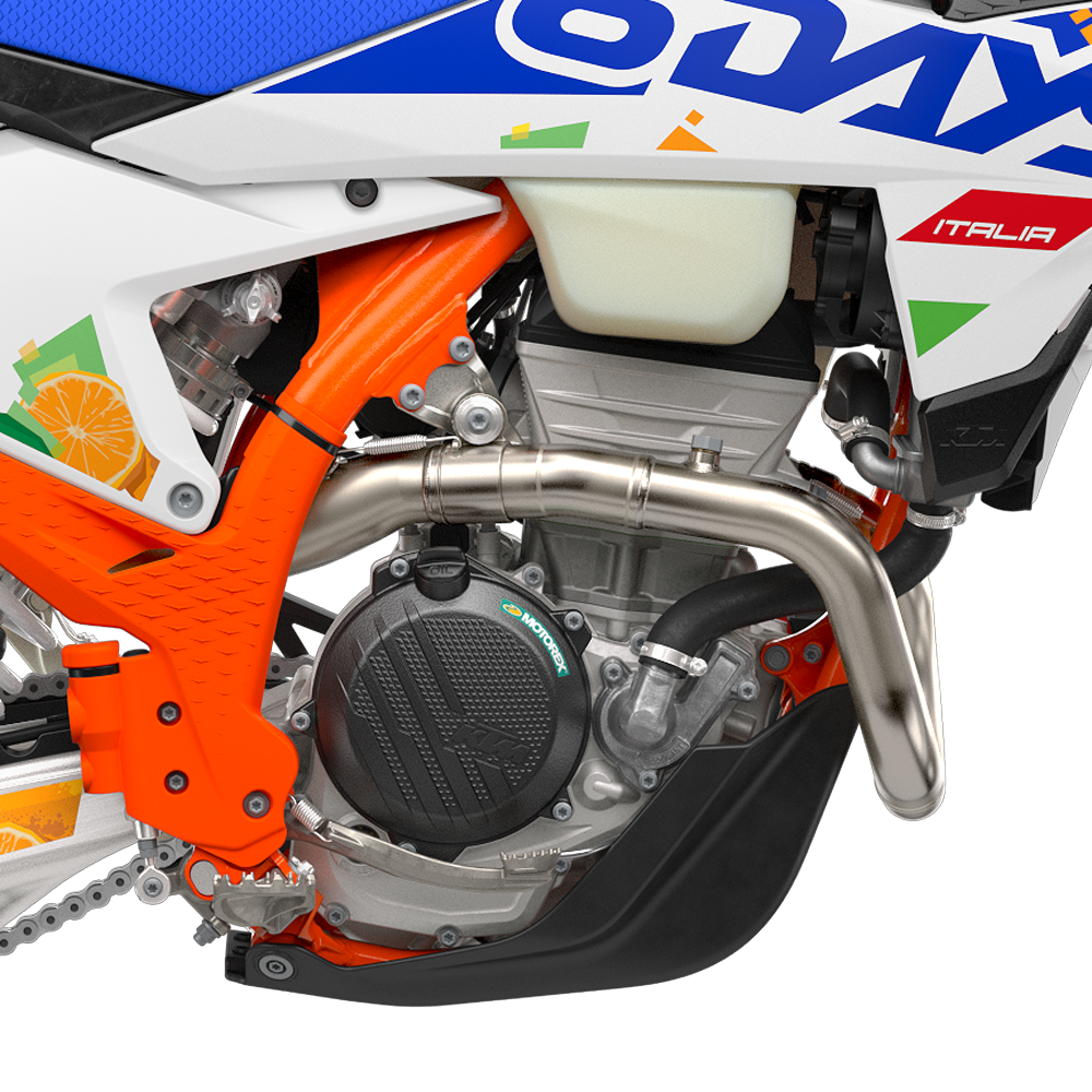 Engine: Light, compact, and weighing only 28,8 kg, the KTM 350 EXC-F engine is an outstanding bit of engineering. The engine maintains its winning ways with a 2° backward tilt, impeccable center of gravity, and a high-revving, intelligent low-friction design, providing the goods at every twist of the throttle.