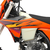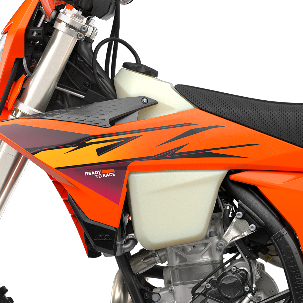 Fuel Tank: The transparent, polythene (XPE) fuel tank is a signature element of the KTM Enduro lineup. Having undergone thorough race testing in everything from the GNCC to the hardest of FIM hard enduros, these tanks are built, well, like tanks! A one-piece fuel pump and filter manage fuel supply, while servicing is made extra simple with easy fuel filter access. What's more, an updated fuel tank roll now holds the tank more firmly in place and protects the frame against scrubbing.