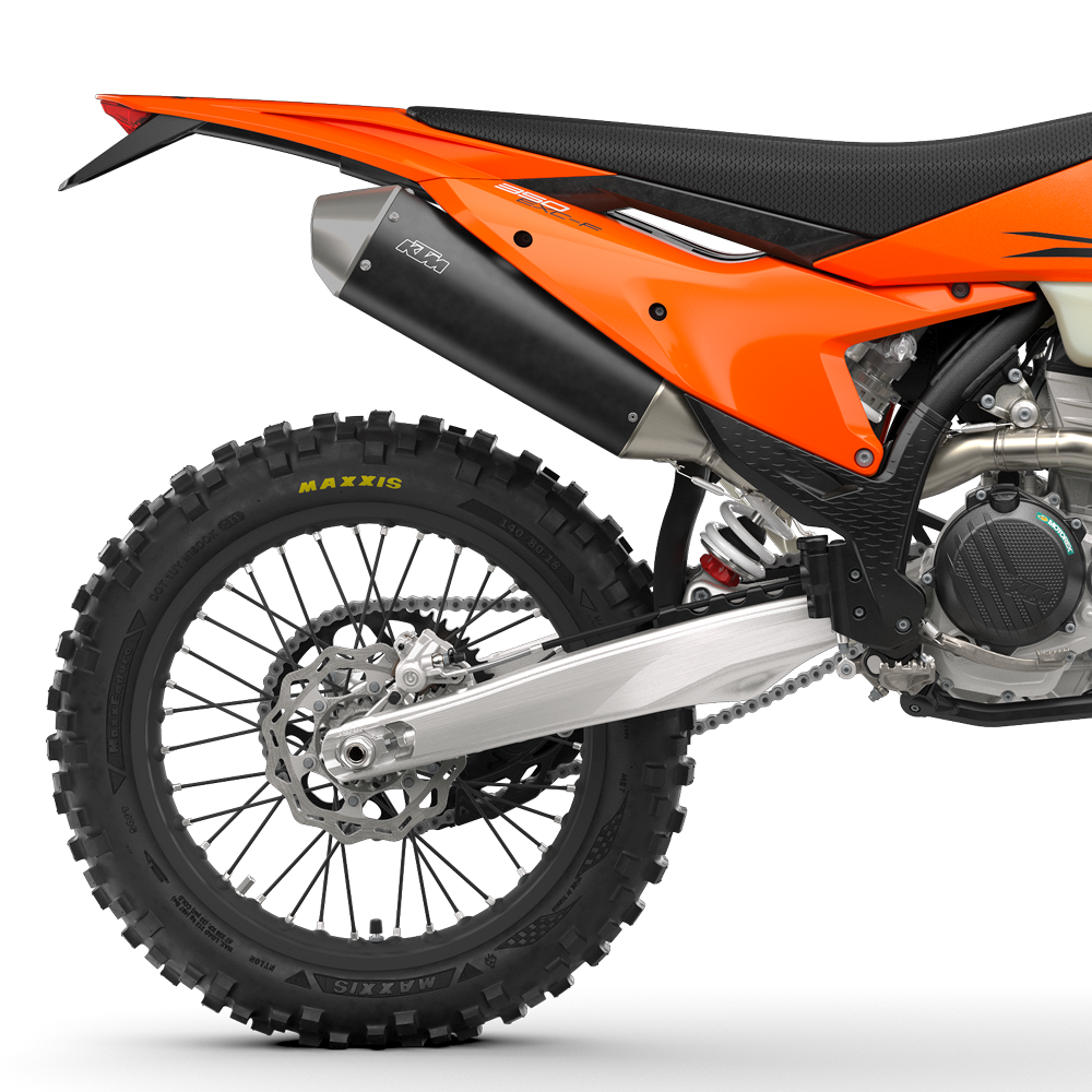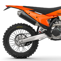 Exhaust: Providing the bark to the KTM 350 EXC-F bite, the exhaust system is designed to deliver hard-hitting performance at the lowest possible weight. The 2-piece header pipe design is made to be as compact as possible, with the routing of the header pipe extremely close to the engine for maximum of mass centralization and minimum exposure to rocks. At the nose-making end, a short, compact silencer is crafted from lightweight aluminum and finished in a premium matt black coating.