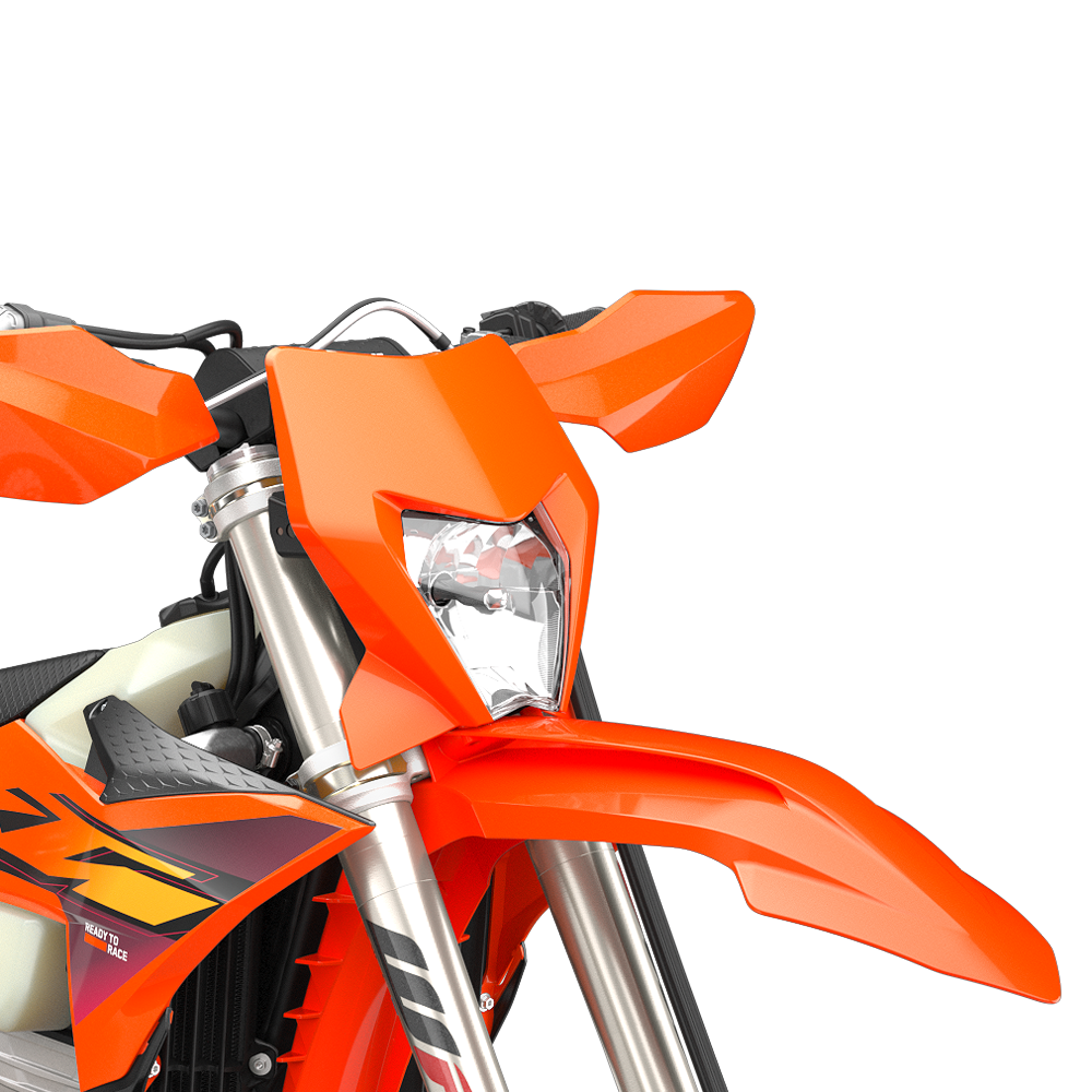 LED headlight: Lighting the way forward, the KTM Enduro range features an LED headlight unit and light mask. The mask itself features improved triple clamp protection against roost and does away with the rubber mounting straps for improved fitment. Most importantly, the LED lighting unit provides serious illumination, making riding in the dark a completely new experience.