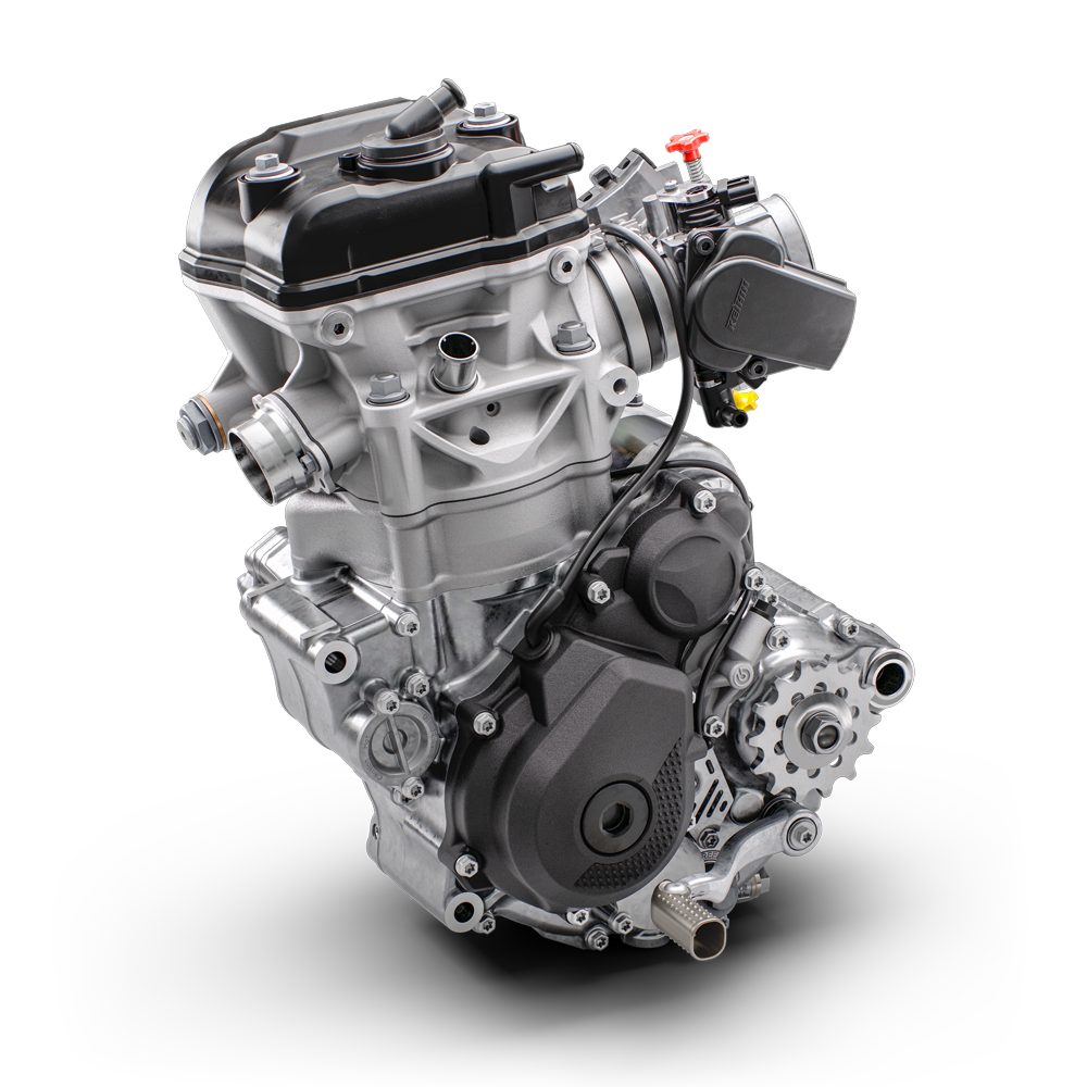 Performance: The KTM SX-F engine is tilted 2° backward, this means greatly improved mass centralization and reduced overall weight, benefiting handling and anti-squat behavior. A silencer offers an improved response in combination with the mapping switch and provides a slightly quieter exhaust note.
