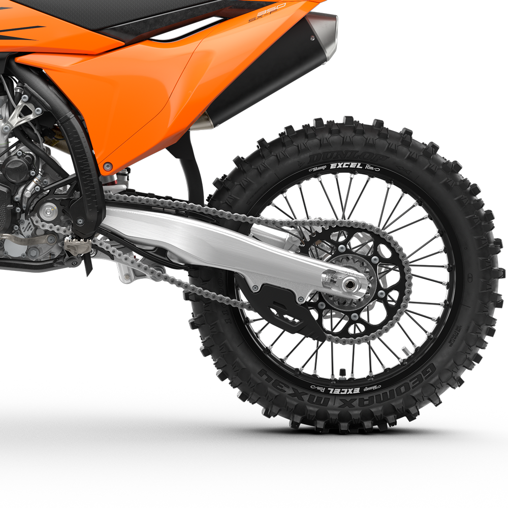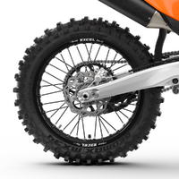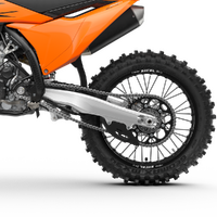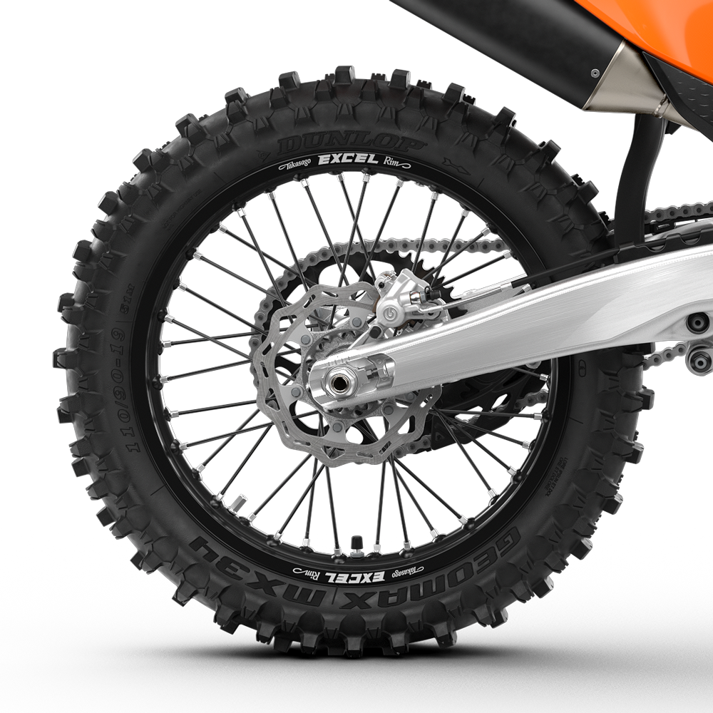 Tires: Getting power hooked into the dirt is a tough job. However, hours of research and testing have led the KTM Motocross range to the Dunlop GEOMAX MX34. Providing unmatched stability and control at the highest level, the rubber features a rigid carcass and rubber compound that improves damping and absorption, maintaining performance up to 30% longer than previous models. Progressive Cornering Block Technology also improves grip in the berms, while the rear pattern has a tall and wide center block for desirable traction and control everywhere else. Lastly, this unique block arrangement works to dispel mud buildup, ensuring traction in even the muddiest of track conditions.