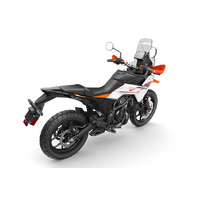 Bodywork: The KTM 390 ADVENTURE range features distinctive KTM-style bodywork and graphics, providing excellent ergonomics and an aggressive look inspired by KTM's vast Rally racing heritage. This can be seen in everything from the headlight mask to the front fender. The tank spoilers and rear side panels are slightly wider than the seat for optimized control when standing on the pegs, while the shape of the fuel tank is optimized to offer freedom of movement when tackling tricky technical terrain. A robust engine guard also makes its intentions known by protecting the engine and exhaust when venturing off the tarmac into the dirt.