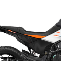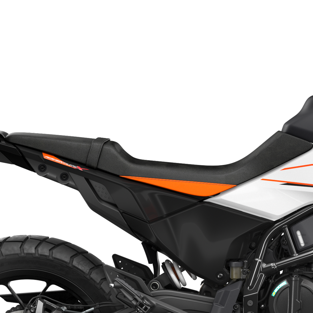 Seat: The KTM 390 ADVENTURE range features a single-piece stepped seat. The seat can be easily removed for access to the airbox and a small storage compartment underneath. The KTM PowerParts team also specifically developed different seats to match individual customer needs from comfort to riding style.