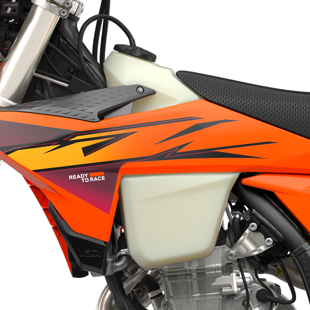 Fuel Tank: The transparent, polythene (XPE) fuel tank is a signature element of the KTM Enduro lineup. Having undergone thorough race testing in everything from the GNCC to the hardest of FIM hard enduros, these tanks are built, well, like tanks! A one-piece fuel pump and filter manage fuel supply, while servicing is made extra simple with easy fuel filter access. What's more, an updated fuel tank roll now holds the tank more firmly in place and protects the frame against scrubbing.
