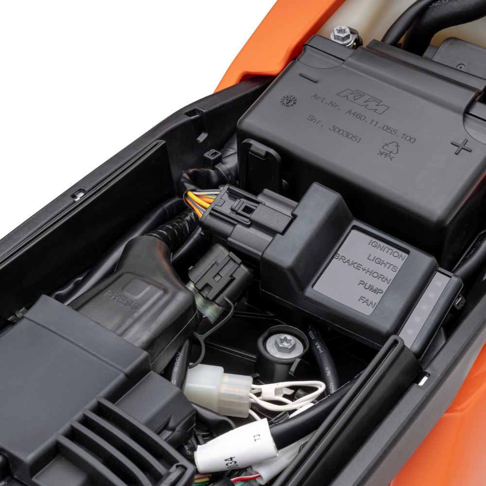 Offroad Control Unit: The Offroad Control Unit - or OCU - is located under the seat and replaces all the electronic fuses and relays. All outputs are switched depending on signals from the voltage regulator and the ECU continuously. In the event of over-current, outputs are deactivated individually. This makes for easy error detection as the status of each output is indicated by a red or green LED light. This means diagnosing an electrical issue out on the trail is as easy as lifting the seat, and there's no more need to carry fiddly fuses.