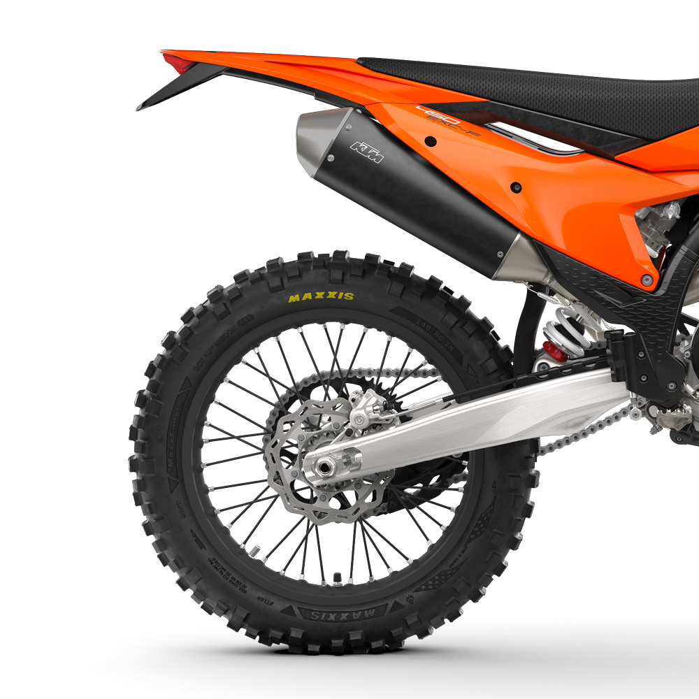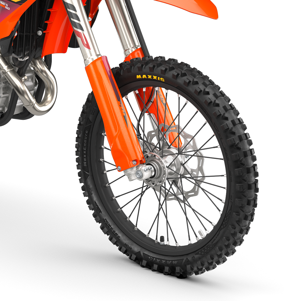Wheels and Tires: The KTM 450 EXC-F rolls on a set of high-strength GIANT alloy wheels coupled to CNC-machined hubs and aluminum nipples. These are wrapped in a set of ultra-grippy Maxxis MaxxEnduro tires providing exceptional traction in all conditions.