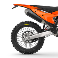 Exhaust: Providing the bark to the KTM 450 EXC-F bite, the exhaust system is designed to deliver hard-hitting performance at the lowest possible weight. The 2-piece header pipe design is made to be as compact as possible, with the routing of the header pipe extremely close to the engine for maximum of mass centralization and minimum exposure to rocks. At the nose-making end, a short, compact silencer is crafted from lightweight aluminum and finished in a premium matt black coating.