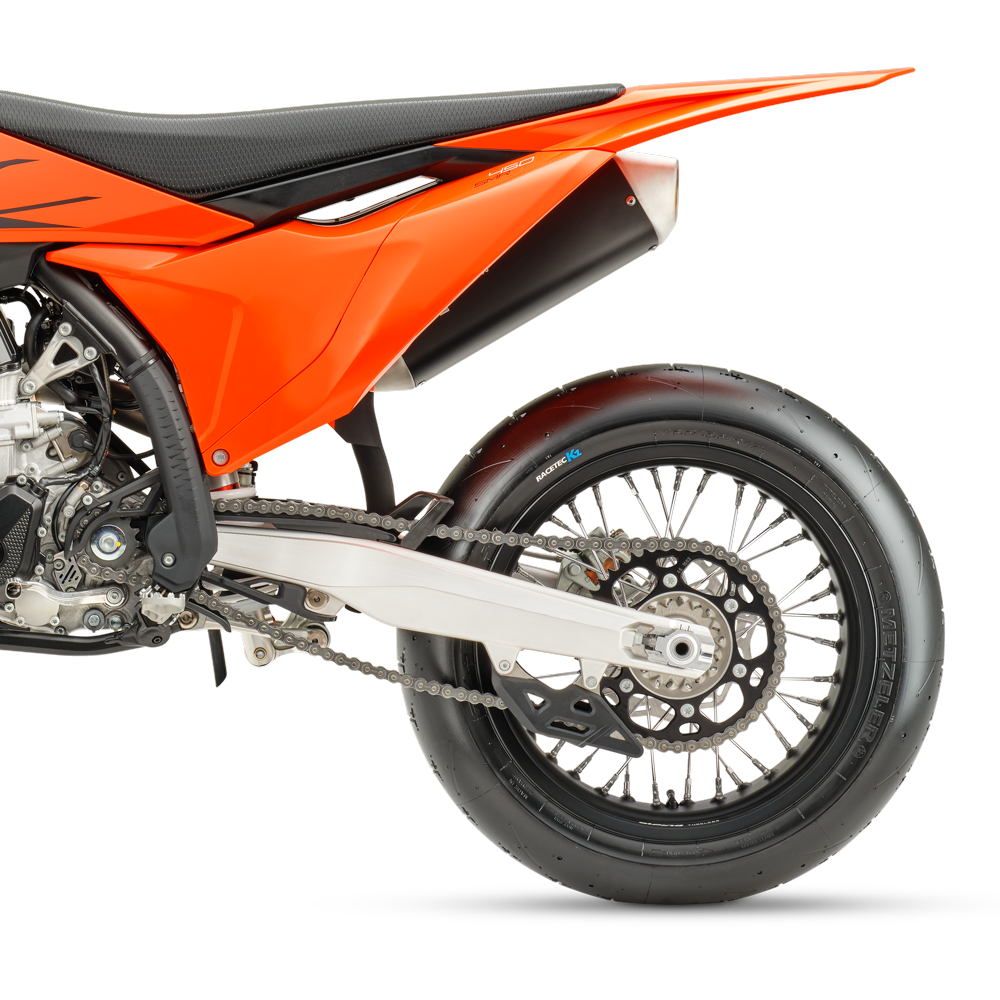 Performance: The KTM 450 SMR engine is tilted 2° backward, resulting in a 3mm lower front sprocket position. All of this means greatly improved mass centralization and reduced overall weight, benefiting handling and anti-squat behavior.