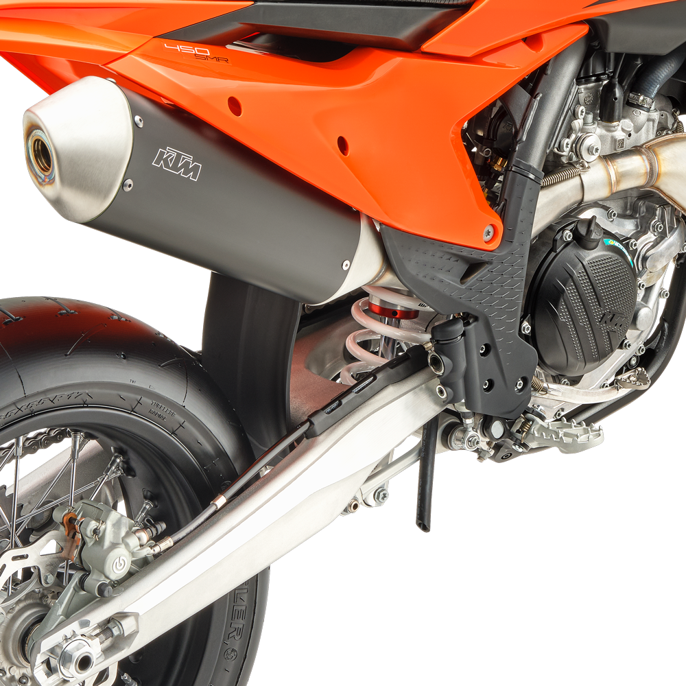 More Usable Power: The KTM 450 SMR features one of the most exhilarating 4-stroke engines in the paddock, with its SOHC powerplant exemplifying cutting-edge engineering. The silencer offers exceptional response in combination with the mapping switch and provides a slightly quieter exhaust note. For those looking for more, a quick visit to the KTM PowerParts catalog will take things to the next level.