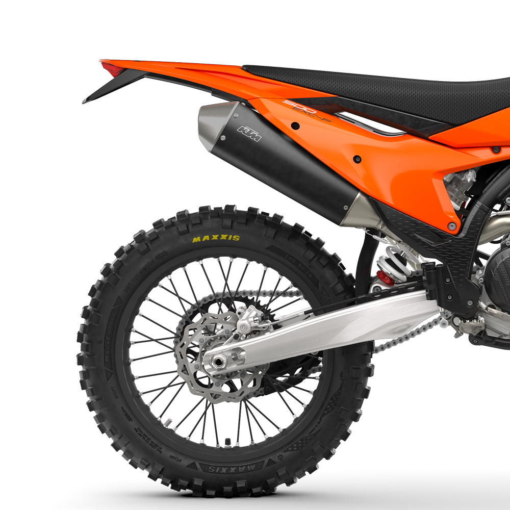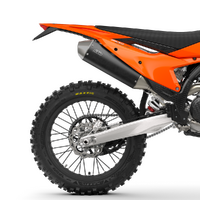 Exhaust: Providing the bark to the KTM 500 EXC-F bite, the exhaust system is designed to deliver hard-hitting performance at the lowest possible weight. The 2-piece header pipe design is made to be as compact as possible, with the routing of the header pipe extremely close to the engine for maximum of mass centralization and minimum exposure to rocks. At the nose-making end, a short, compact silencer is crafted from lightweight aluminum and finished in a premium matt black coating.
