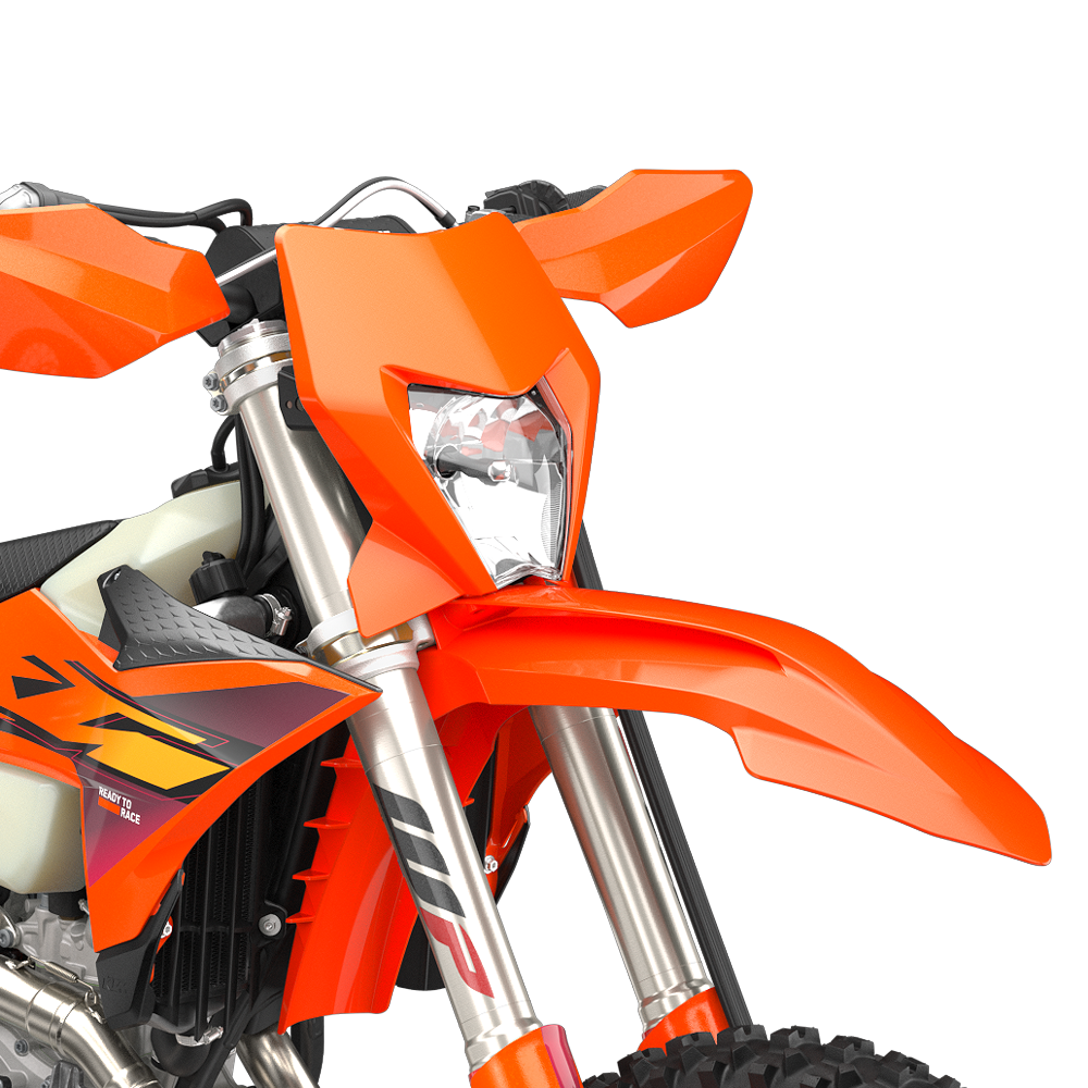LED headlight: Lighting the way forward, the KTM Enduro range features an LED headlight unit and light mask. The mask itself features improved triple clamp protection against roost and does away with the rubber mounting straps for improved fitment. Most importantly, the LED lighting unit provides serious illumination, making riding in the dark a completely new experience.