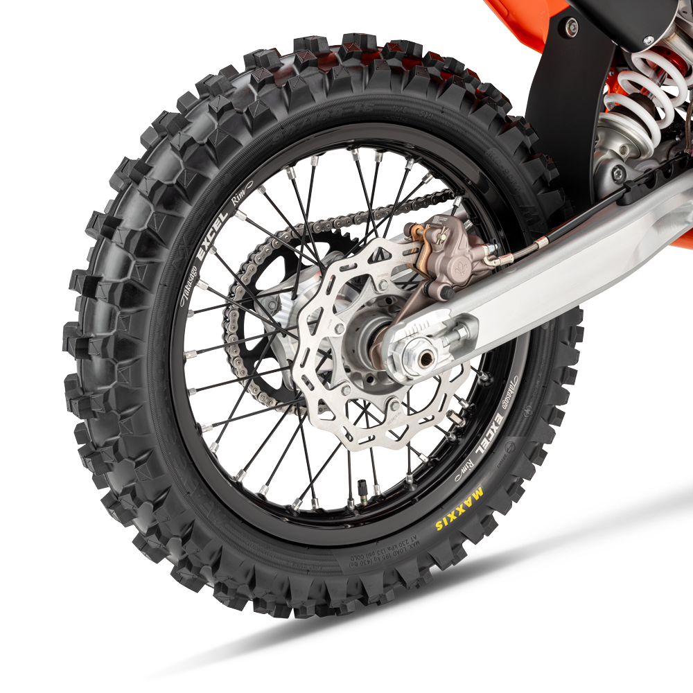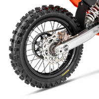 Wheels and Tires: Keeping the show on the dirt are black Excel-branded rims and CNC machined hubs fitted with MAXXIS MAXXCROSS MX-ST tires. Not only does this combination deliver outstanding performance on a variety of terrain, but the pattern design and rubber compounds deliver exceptional straight-line stability and excellent traction. As always, the KTM 85 SX is available for order with two rims sizes -19/16 and 17/14.