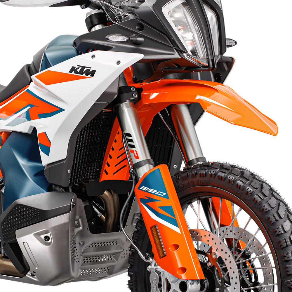 Bodywork: Inspired by the Dakar-winning KTM 450 RALLY, a completely reworked and striking front end gives the KTM 890 ADVENTURE R true READY TO RACE looks. In addition, the structure below the fairing makes use of 2 forged aluminum brackets that provide maximum stiffness to the front mask, windshield, and instrument tower. This, along with using in-mold graphics for durability and a high front fender to keep the front wheel rotating freely in heavy dirt, makes the KTM 890 ADVENTURE R ready for any adventure.