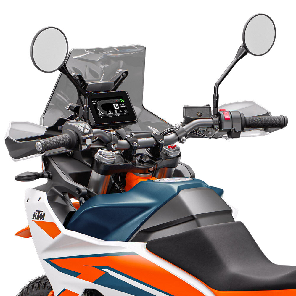 Upgraded TFT Display: A state-of-the-art full 5" TFT display keeps you informed with everything you need to know about the machine below you. Featuring improved functionality, each function is illustrated by an infographic of the motorcycle to directly show the user the relevant field of adjustment. An optically bonded mineral glass display ensures optimum scratch and glare resistance. Additionally, an optional Connectivity Unit allows the connection between the KTMconnect app and the TFT via Bluetooth for Turn-by-Turn+ navigation, music, incoming calls, and quick access to KTM roadside assistance.