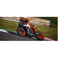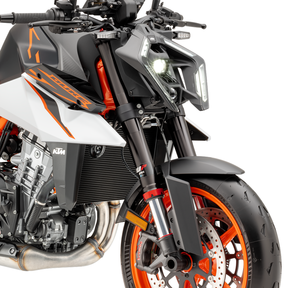Fork: Front-end feel takes on a new meaning when it comes to the KTM 990 DUKE R, highlighted by a 48 mm WP APEX Open Cartridge upside-down fork that has 143 mm of travel. It's no less than 34% stiffer and has upgraded settings that promote extreme performance, paired with a new forged aluminum triple clamps to match the flex of the fork. What riders can count on is a more planted feel and with better control. It's fully-adjustable, simple to dial in, and inspires confidence from the first time you drop into a turn.