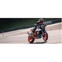 Sportier in its stance, more intent in its purpose, and upgraded to the extreme. The KTM 990 DUKE R brings added flare to the middleweight Naked market with maximum fight that will get you further, faster. Homologated to carry a pillion, it's sold as a single-seater with pillion parts available separately, setting a new standard with an increased power output of 130 PS, and boasting sharper ergonomics, coupled with upgraded WP APEX suspension and never-before-seen electronic functionality. Designed, developed, and produced in Austria.