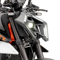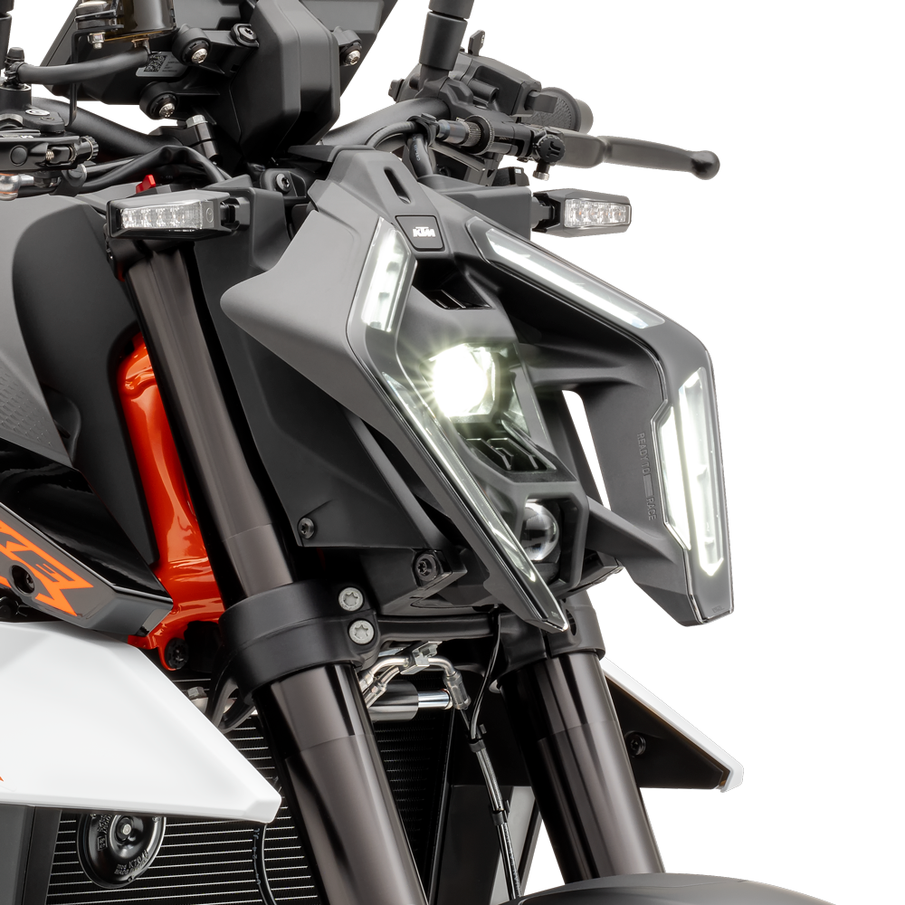 LED Headlight: When day turns to night, the dynamic lightweight LED headlight equipped on the KTM 990 DUKE R serves its ultimate purpose, with a smart touch as well. Daytime running lights automatically adjust in intensity and function in darker conditions, an automatic low beam offers assistance by remaining lit for a moment even after the ride is complete, and its improvements are clear.