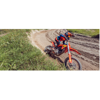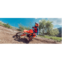 Front suspension: The KTM SX-E 5 boasts a fully adjustable, upside-down WP XACT air fork with a 35 mm tube diameter and 205 mm of travel. This ensures outstanding comfort, damping characteristics, and directional stability. Another main benefit for junior riders is that the air spring fitted in the left fork leg can be adjusted perfectly to the rider's weight using a simple air pump.