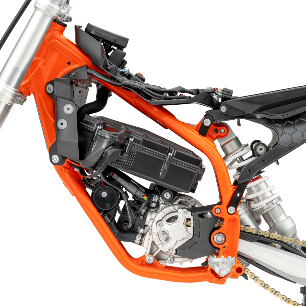 Battery: The KTM SX-E 5 is fitted with 84 modern lithium-ion cells in a robust die-cast aluminum casing that is mounted just above the electric motor. This means the stored energy is 907 Wh, which is enough for more than two hours of riding for a beginner and approximately 30 min full-throttle racing, depending on conditions and terrain. The integrated battery management system (BMS) ensures the safety and longevity of the battery pack. Charging time has been reduced, with 0-80% capacity achievable in 45 minutes while 0-100% is possible in just 70 minutes.
