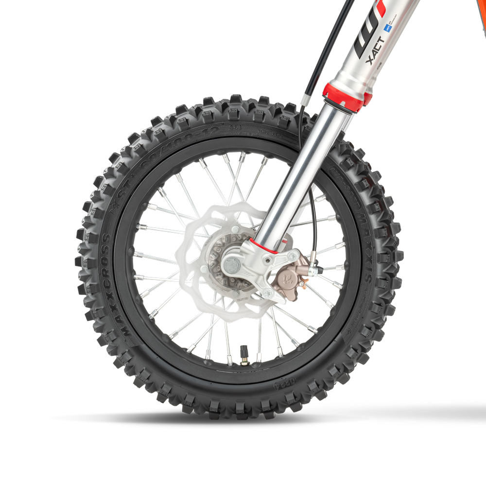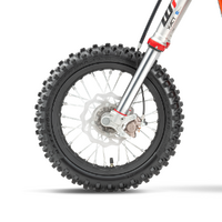 Brakes: The KTM SX-E 5 is fitted with front and rear hydraulic brakes, combined with lightweight wave discs that are easy to control even for the youngest riders; helping to build their confidence, and teaching them correct brake control.
