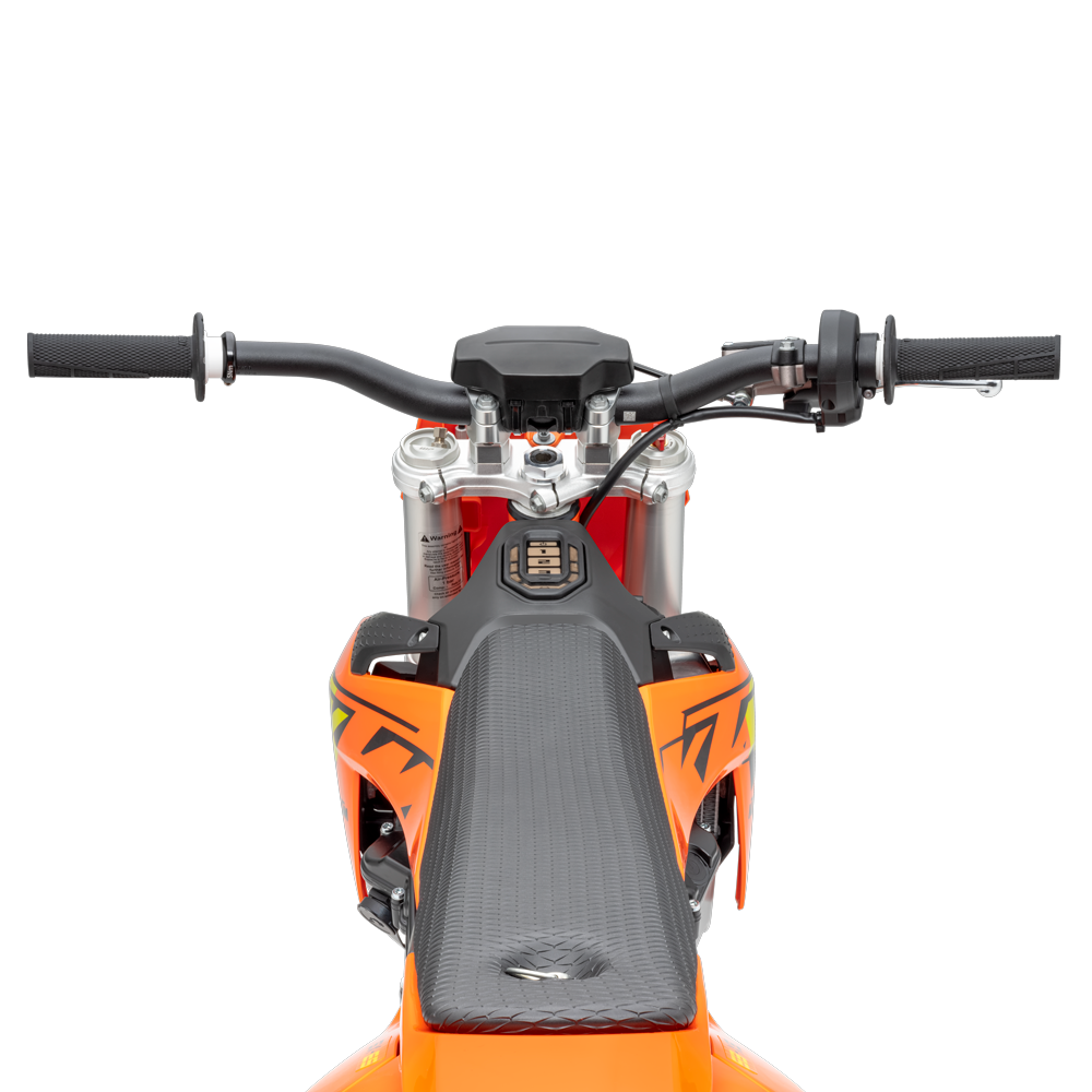 Handlebar: The KTM SX-E 5 uses high-quality tapered NEKEN handlebars. This allows for a lock-on ODI grip to be mounted on the left side while the right side features a throttle assembly with a vulcanized ODI grip, specifically developed for the electronic drive. An additional crash pad on the handlebar brace protects the rider from rough contact.