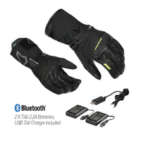 A waterproof and electrically heated glove with a leather palm and flexible knuckle protection, developed for daily commuters and riders in cold conditions. The Azra is fitted with protection at the knuckles, fingers, and palm of the hand. The knuckle protector is made of TPR, which is a flexible yet robust rubber with a great strength-to-weight ratio. The palm and finger protection are made of soft and flexible EVA padding, and the palm is reinforced with leather all the way up to the outside of the little finger. It is waterproof thanks to its Raintex membrane, and excess rainwater that accumulates in the mesh area between the membrane and outer shell is drained by the Water Exhaust. The Centrack buckle is developed to permanently hold the wrist strap, preventing it from slipping through the buckle and giving you a hard time getting it back in. Dual Power technology lets you choose between a 7.4- or 12-Volt power supply. Power can be supplied by a battery in the cuff or jacket, or a direct connection to the battery of your motorcycle. There are 4 heating levels, each indicated in their own colour by the battery level indicator. The indicator at the back of the hand also tells you how much power you have left and lets you change the level by pressing it. Alternatively, you can operate these gloves – and other garments – in the MACNA Heated app.
