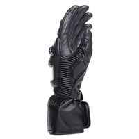 Motorcycle racing gloves in sheepskin leather with carbon knuckle protectors, polyurethane inserts, and pre-curved, thermoformed sleeve.