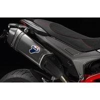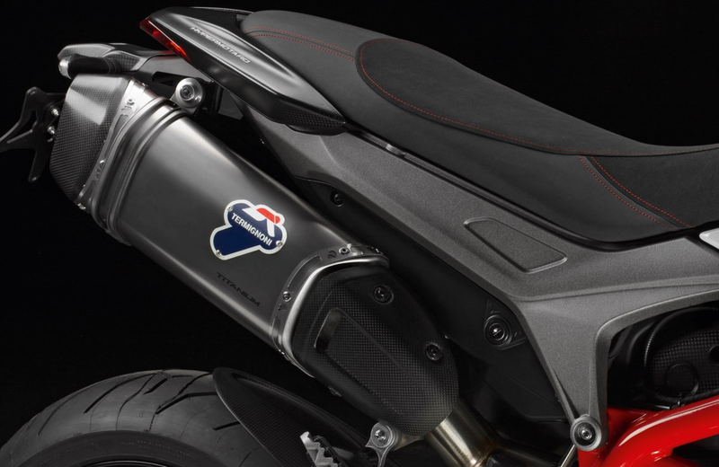 Produced by Termignoni. With titanium silencer and carbon endcap in lifted position for an enhanced dynamic look. The system, along with the included up-map key, which allows enabling the upload of a dedicated mapping, unleashes the power of the Hypermotard engine, boosting its rideability and power delivery. The reduced weight and its power and torque increased by 5% simply highlight the sports qualities of the Hypermotard for unparalleled riding pleasure. The system also includes a high-performance air filter cover for improved fluid dynamic efficiency and rear LED turn indicators for a more attractive look.