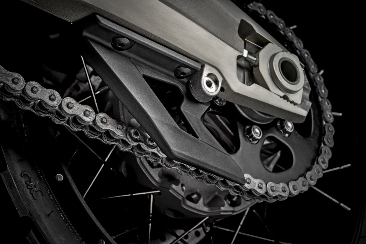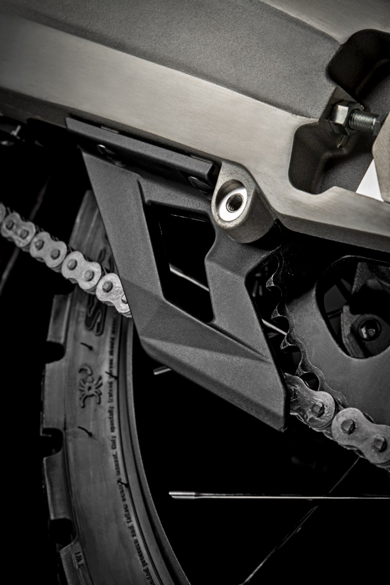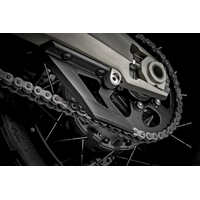 Accessory made in plastic material with optimal mechanical performance, to better protect the transmission parts from debris and the rider in case of fall. Linear but strong design, so as not to renounce to style, not even in the details.