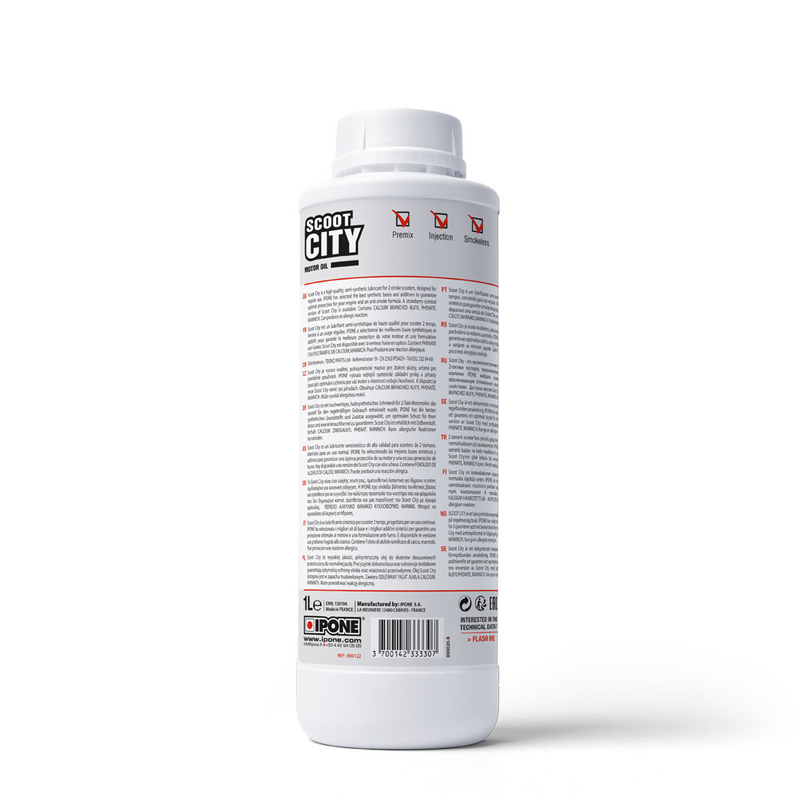 SCOOT CITY is a semi-synthetic motor oil for 2 Stroke scooters, intended for regular use. Suitable for both premix and oil injection applications.