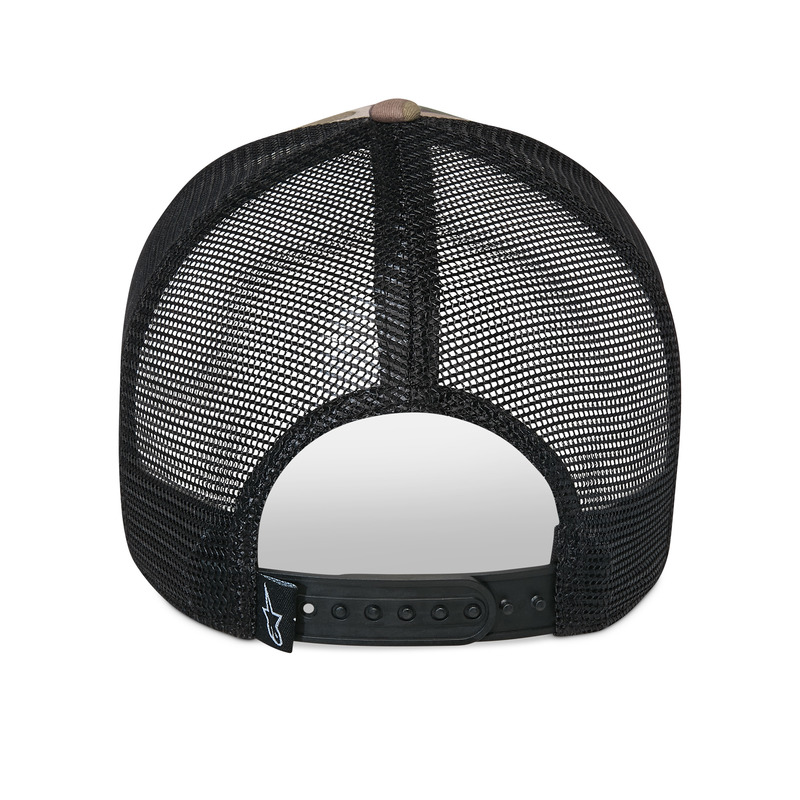 Curved bill cap with structured crown, snap back closure, twill front, mesh back, and oval Astars logo embroidery patch.