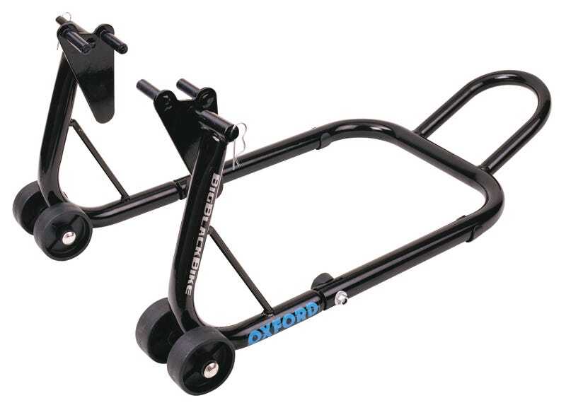 The Oxford Big Black Bike Paddock Stand is exactly as its name suggests. Available as both front and rear stand. The front stand has universal pins for the forks whilst the rear has a swingarm. Key Features: Robust construction using 32mm steel tube, Four chunky wheels for maximum stability, Extended handles for maximum leverage