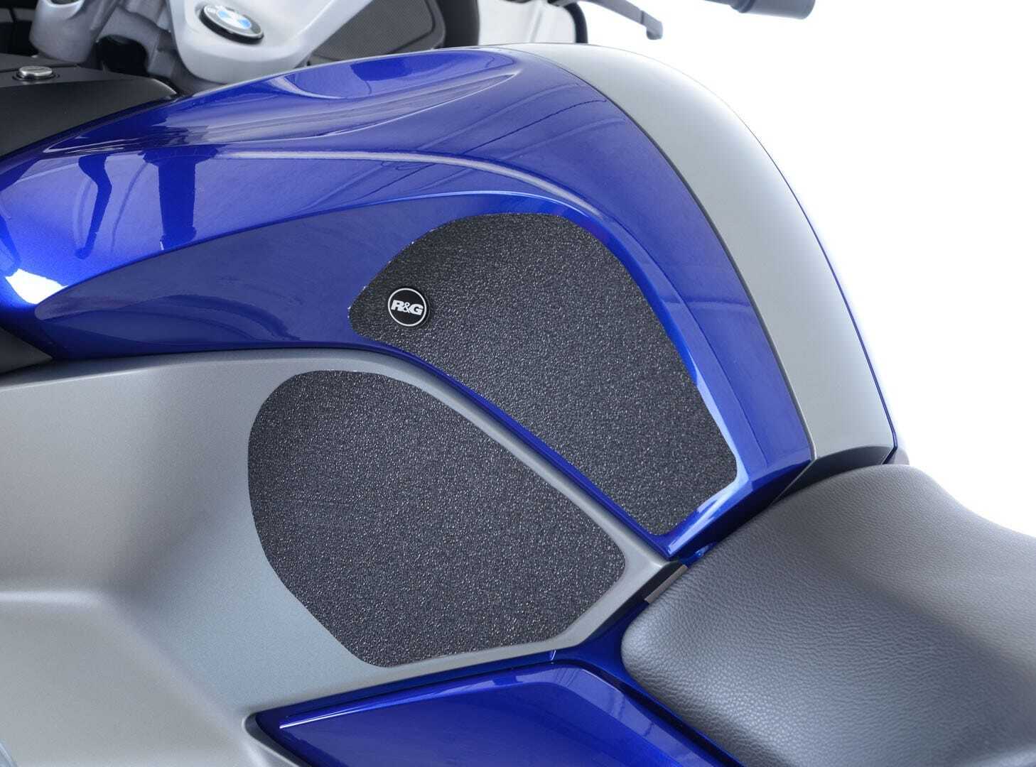 R&G Tank Traction Grip kits are available for many different bike styles and brands, with new applications released regularly. The unique R&G Tank Traction Grip texture was specifically designed to be both soft and durable, providing the rider with the grip and feel he/she needs to assist in better bike control, enabling the rider to maintain a stable body position while cornering and braking, whilst also relieving fatigue and providing the rider with complete confidence allowing him/her to fully focus on the road (or track) ahead instead of slipping and sliding on the tank. Each Tank Traction Grip kit is supplied with precision pre-cut adhesive pieces, designed to fit the intended bike, typically in either 2, 4 or 6 pieces (in total) depending on the shape of the tank and adjoining fairing. The high-strength adhesive backing ensures a highly durable product that will stay exactly where you put it, as well as not affecting or damaging paintwork. Each R&G Tank Traction Grip kit is available in black and ultra-clear finishes to blend into your bike's paintwork or stand out, depending on your preference. R&G Eazi-Grip™ works in both wet and dry conditions and is equally at home on the track as it is on the commute home!Please note: R&G Tank Traction Grips now come with a 25mm diameter stick on emblem. This Tank Traction Grip has been specially designed for the BMW R1200RT '14- & R1250RT '19-. Made in the UK.