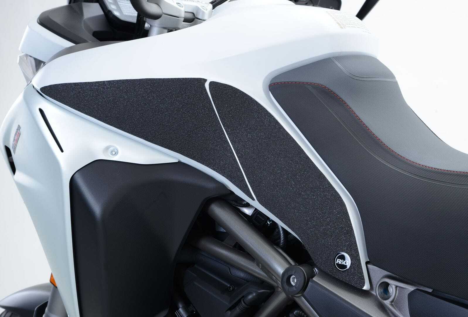 R&G Tank Traction Grip kits are available for many different bike styles and brands, with new applications released regularly. The unique R&G Tank Traction Grip texture was specifically designed to be both soft and durable, providing the rider with the grip and feel he/she needs to assist in better bike control, enabling the rider to maintain a stable body position while cornering and braking, whilst also relieving fatigue and providing the rider with complete confidence allowing him/her to fully focus on the road (or track) ahead instead of slipping and sliding on the tank. Each Tank Traction Grip kit is supplied with precision pre-cut adhesive pieces, designed to fit the intended bike, typically in either 2, 4 or 6 pieces (in total) depending on the shape of the tank and adjoining fairing. The high-strength adhesive backing ensures a highly durable product that will stay exactly where you put it, as well as not affecting or damaging paintwork. Each R&G Tank Traction Grip kit is available in black and ultra-clear finishes to blend into your bike's paintwork or stand out, depending on your preference. R&G Tank Traction Grips work in both wet and dry conditions and is equally at home on the track as it is on the commute home! Please note: R&G Tank Traction Grips now come with a 25mm diameter stick on emblem. This 4 piece R&G Tank Traction Grip kit has been specially designed for the Ducati Multistrada 1200 ENDURO '16- models. Made in the UK.