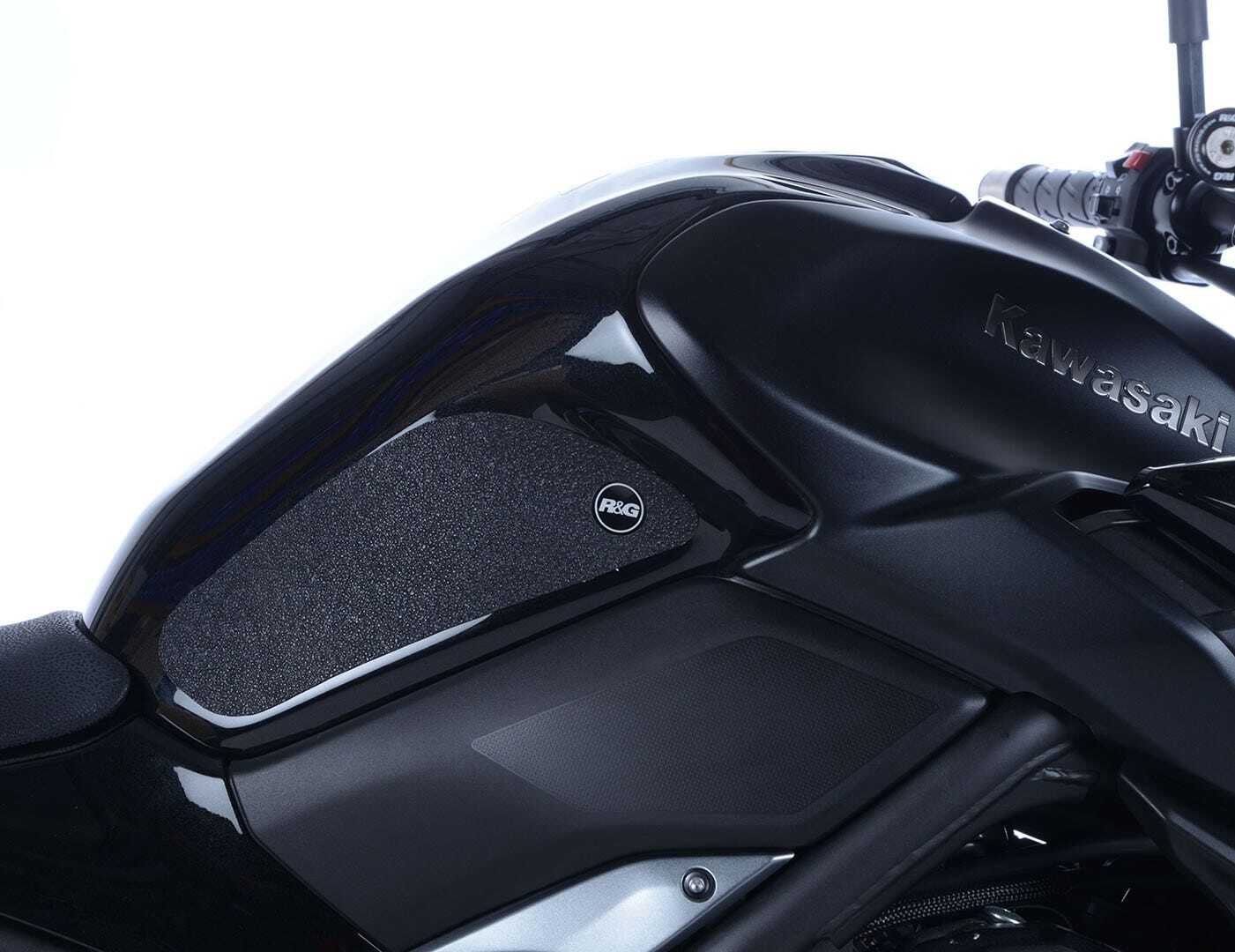 R&G Tank Traction Grips are available for many different bike styles and brands, with new applications released regularly. The unique R&G Tank Traction Grip texture was specifically designed to be both soft and durable, providing the rider with the grip and feel he/she needs to assist in better bike control, enabling the rider to maintain a stable body position while cornering and braking, whilst also relieving fatigue and providing the rider with complete confidence allowing him/her to fully focus on the road (or track) ahead instead of slipping and sliding on the tank.Each Tank Traction Grip kit is supplied with precision pre-cut adhesive pieces, designed to fit the intended bike, typically in either 2, 4 or 6 pieces (in total) depending on the shape of the tank and adjoining fairing. The high-strength adhesive backing ensures a highly durable product that will stay exactly where you put it, as well as not affecting or damaging paintwork. Each R&G Tank Traction Grip kit is available in black and ultra-clear finishes to blend into your bike's paintwork or stand out, depending on your preference. R&G Tank Traction Grips work in both wet and dry conditions and is equally at home on the track as it is on the commute home!This 2 piece R&G Tank Traction Grips have been specially designed for the Kawasaki Z900 '17- & Kawasaki ZH2 '20- models.Made in the UK.