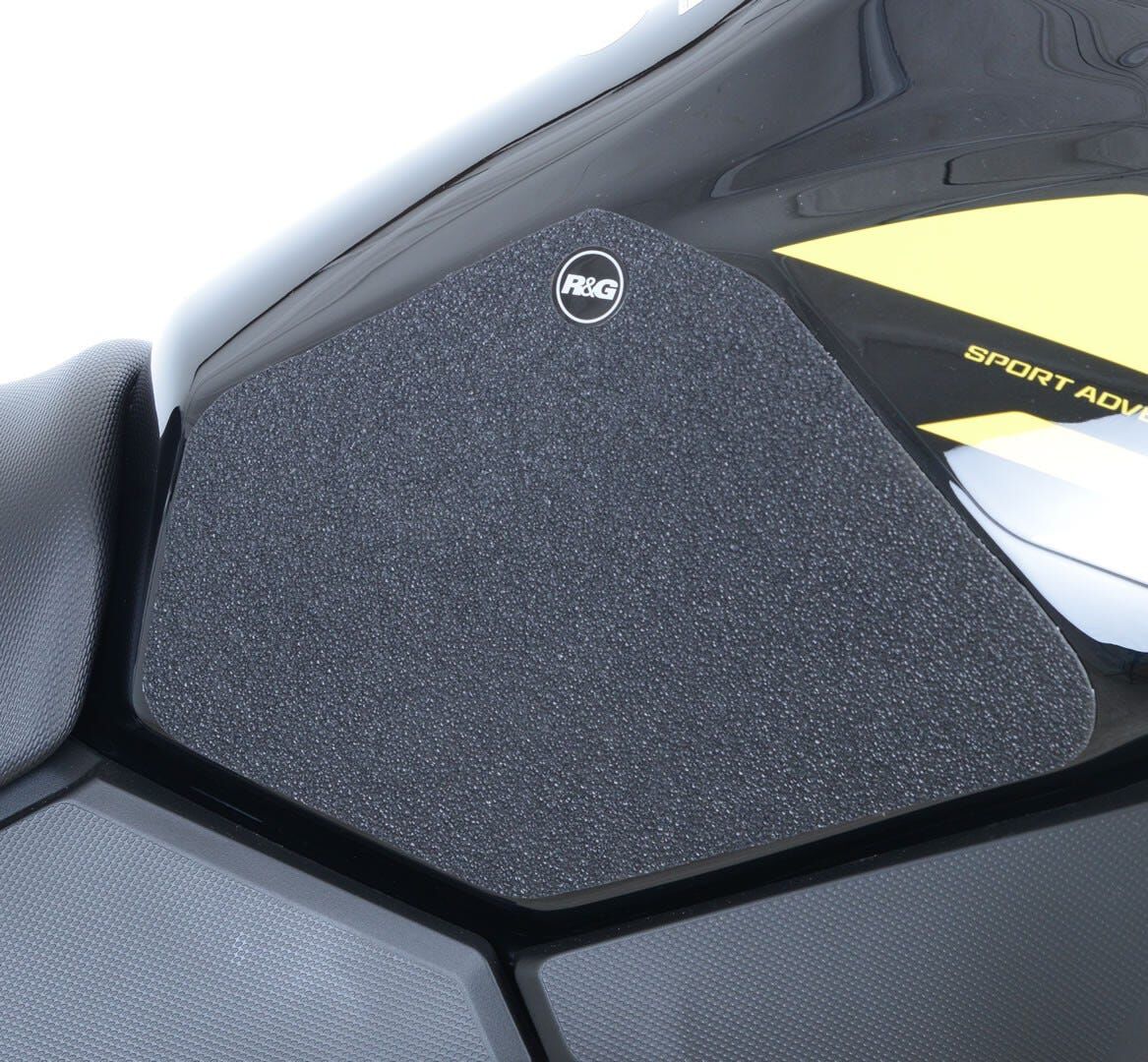 R&G Tank Traction Grip kits are available for many different bike styles and brands, with new applications released regularly. The unique R&G texture was specifically designed to be both soft and durable, providing the rider with the grip and feel he/she needs to assist in better bike control, enabling the rider to maintain a stable body position while cornering and braking, whilst also relieving fatigue and providing the rider with complete confidence allowing him/her to fully focus on the road (or track) ahead instead of slipping and sliding on the tank. Each Tank Traction Grip kit is supplied with precision pre-cut adhesive pieces, designed to fit the intended bike, typically in either 2, 4 or 6 pieces (in total) depending on the shape of the tank and adjoining fairing. The high-strength adhesive backing ensures a highly durable product that will stay exactly where you put it, as well as not affecting or damaging paintwork. Each R&G Tank Traction Grip kit is available in black and ultra-clear finishes to blend into your bike's paintwork or stand out, depending on your preference. R&G Tank Traction Grips work in both wet and dry conditions and is equally at home on the track as it is on the commute home! This 2 piece R&G Tank Traction Grip kit has been specially designed for the Suzuki V-Strom 250 '17-. Made in the UK.