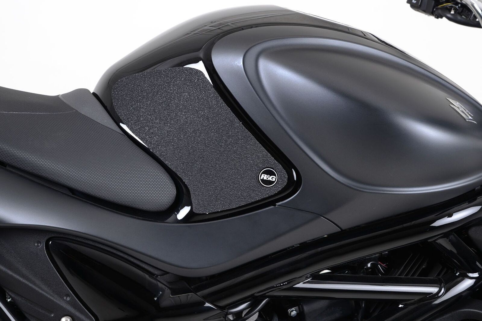 R&G Tank Traction Grip kits are available for many different bike styles and brands, with new applications released regularly. The unique R&G Traction Grip texture was specifically designed to be both soft and durable, providing the rider with the grip and feel he/she needs to assist in better bike control, enabling the rider to maintain a stable body position while cornering and braking, whilst also relieving fatigue and providing the rider with complete confidence allowing him/her to fully focus on the road (or track) ahead instead of slipping and sliding on the tank. Each Tank Traction Grip kit is supplied with precision pre-cut adhesive pieces, designed to fit the intended bike, typically in either 2, 4 or 6 pieces (in total) depending on the shape of the tank and adjoining fairing. The high-strength adhesive backing ensures a highly durable product that will stay exactly where you put it, as well as not affecting or damaging paintwork. Each R&G Tank Traction Grip kit is available in black and ultra-clear finishes to blend into your bike's paintwork or stand out, depending on your preference. R&G Tank Traction Grips work in both wet and dry conditions and is equally at home on the track as it is on the commute home!Please note: R&G Tank Traction Grips now come with a 25mm diameter stick on emblem. This 2pcs Tank Traction Grip has been specially designed for the Suzuki SFV Gladius 650 '09- models. Made in the UK.