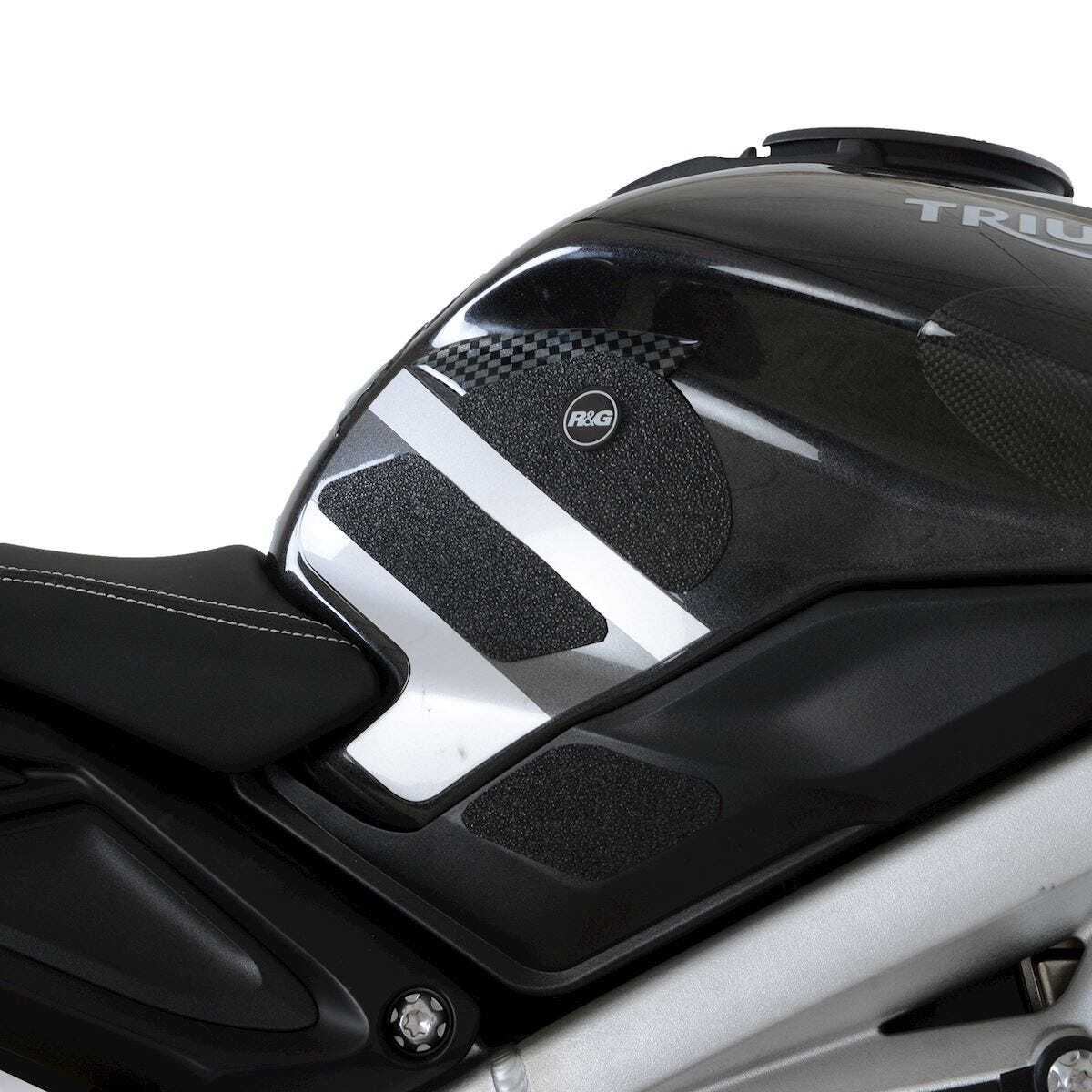 R&G Tank Traction Grip kits are available for many different bike styles and brands, with new applications released regularly. The unique R&G Tank Traction Grip texture was specifically designed to be both soft and durable, providing the rider with the grip and feel he/she needs to assist in better bike control, enabling the rider to maintain a stable body position while cornering and braking, whilst also relieving fatigue and providing the rider with complete confidence allowing him/her to fully focus on the road (or track) ahead instead of slipping and sliding on the tank. Each Tank Traction Grip kit is supplied with precision pre-cut adhesive pieces, designed to fit the intended bike, typically in either 2, 4 or 6 pieces (in total) depending on the shape of the tank and adjoining fairing. The high-strength adhesive backing ensures a highly durable product that will stay exactly where you put it, as well as not affecting or damaging the paintwork. Each R&G Tank Traction Grip kit is available in black and ultra-clear finishes to blend into your bike's paintwork or stand out, depending on your preference. R&G Eazi-Grip™ works in both wet and dry conditions and is equally at home on the track as it is on the commute home! This 6-piece R&G Tank Traction Grip kit has been specially designed for the Triumph Daytona Moto2™ 765 '20- model. """